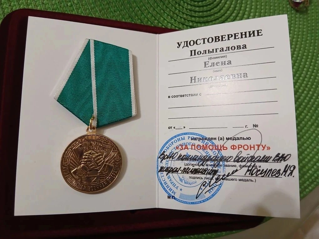 Высокими наградами Елена Николаевна отмечена за помощь, направленную на укрепление боевой готовности военнослужащих ВС РФ. Медаль «За помощь фронту» вручена от имени Врио командующего войсками Восточного военного округа генерал-лейтенанта Михаила Носулева, благодарственное письмо подписано командующим группировкой войск «Восток» генерал-полковником Андреем Иванаевым.