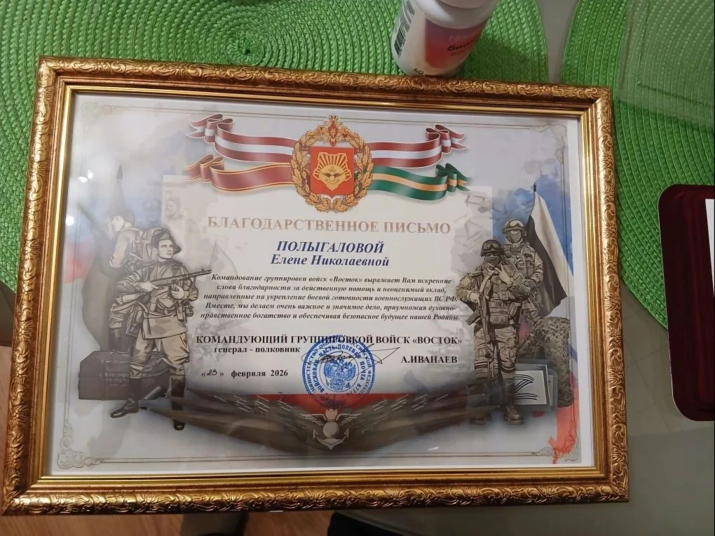 Ветеран филиала АО «СО ЕЭС» ОДУ Востока, активистка движения «Дальневосточный тыл» Елена Николаевна Полыгалова удостоена медали «За помощь фронту» и благодарственного письма командующего группировкой войск «Восток». Торжественное награждение состоялось в Хабаровске в рамках научно-практического форума «Народ и армия едины».