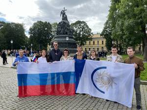Коллектив Новгородского РДУ развернул российский триколор у памятника "Тысячелетие России" и на Рюриковом городище